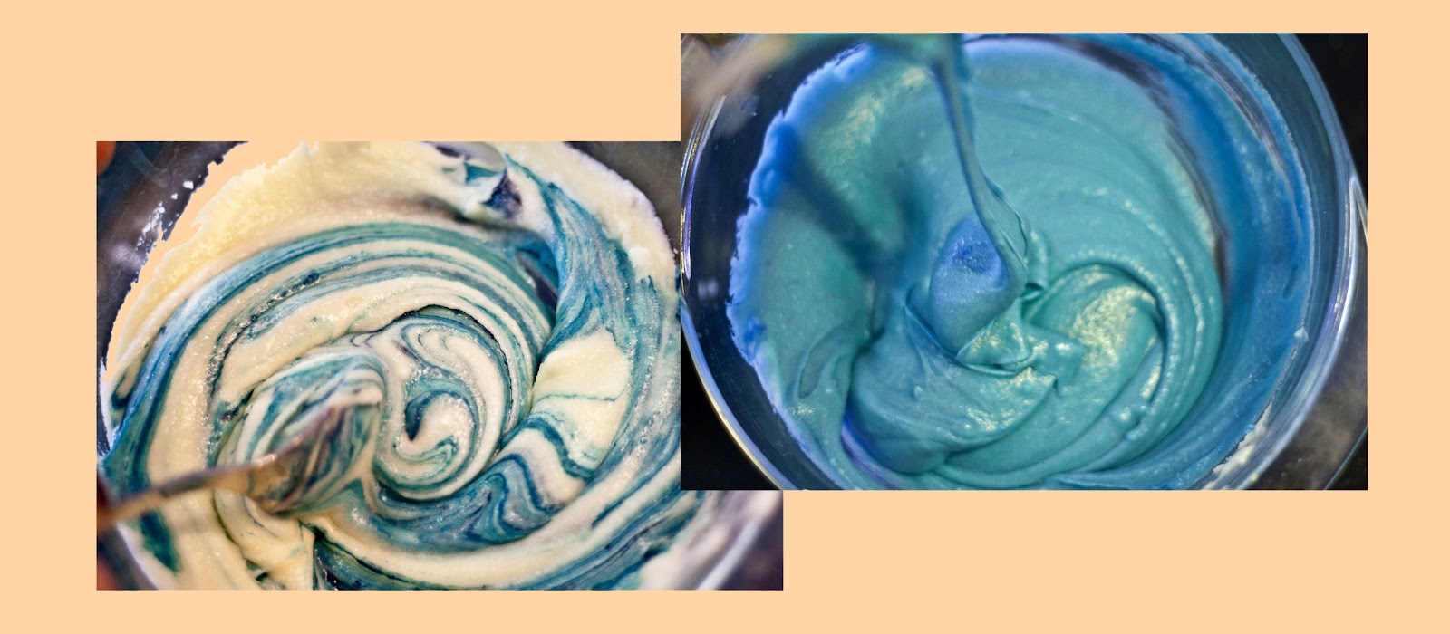- 125 gr queso crema frío (mínimo 25% grasa) --> yo siempre uso mascarpone60 gr mantequilla a Tª ambiente300 gr azúcar glasscolorante azul fuerte en pasta