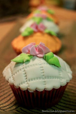 Las seis últimas las unté también con ganache y las decoré con fondant en dos colores, naranja y blanco, utilicé un cortante con forma de ondas y le hice unas marcas formando una especie de acolchado, les puse las flores y hojitas de glasa y estas también me las llevé al trabajo. Volaron enseguida