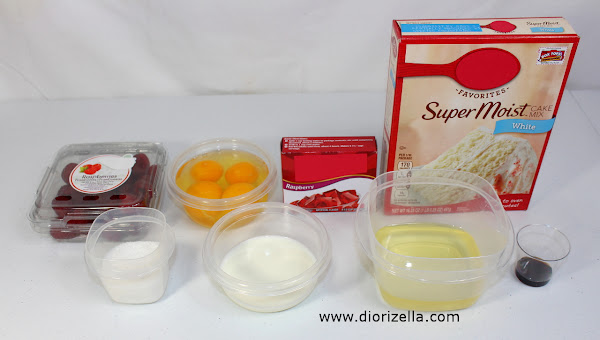 Los ingredientes que vas a necesitar son: mezcla para bizcocho blanco, gelatina de frambuesa, huevos, frambuesas, azúcar, leche, aceite y extracto de vainilla o sabor de frambuesa.