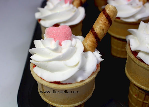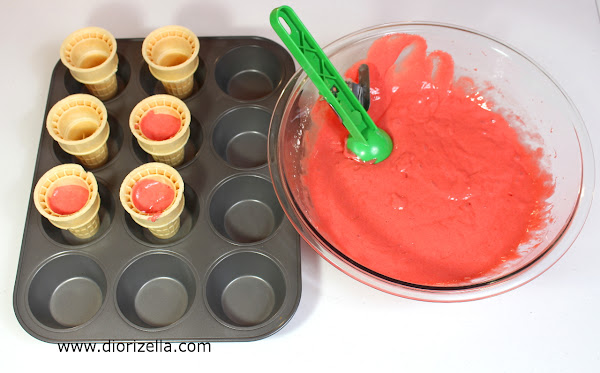 Coloca las barquillas en una bandeja para cupcakes. Vierte 1/4 tz de la mezcla en cada barquilla. Luego vierte el resto de la mezcla en capacillos. Hornea por 15 a 25 minutos aproximadamente. Deja enfriar los cupcakes y corta la barriguita de los que hiciste en las barquillas.