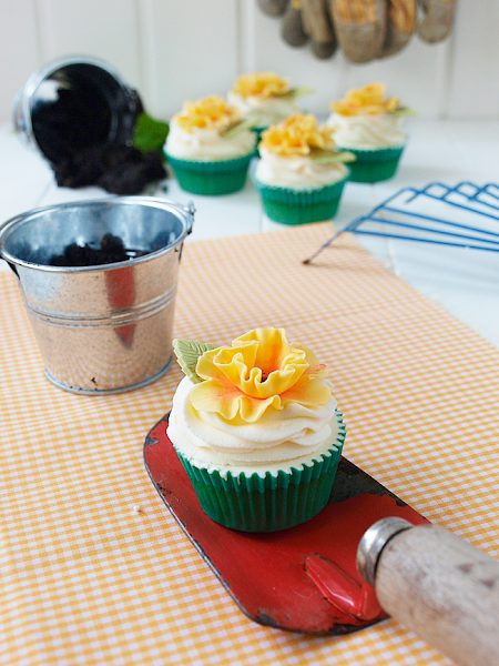 Para decorar los cupcakes, con la ayuda de la maga pastelera vamos haciendo remolinos altos de crema y coronamos con una pequeña dalia cada uno de ellos, os recomiendo que antes de colocar la flor los llevéis unos minutos al frigorífico para que el buttercream endurezca y la flor no se hunda.