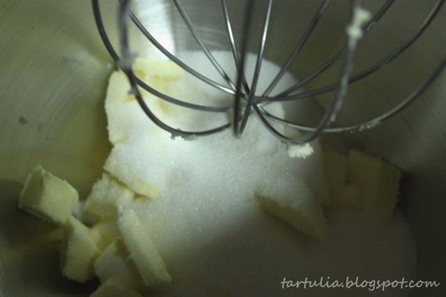 Batimos la mantequilla cortada en trocitos ( para que la temperatura sea uniforme) con el azúcar, hasta que se forme una crema. Añadimos los huevos uno a uno, ligeramente batidos para que se integren mejor en la masa y seguimos