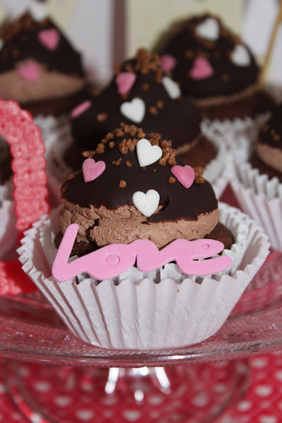 Derretimos el chocolate con la mantequilla en el microondas, como se ha descrito al principio de la entrada, poco a poco y a temperatura baja. Colocamos la mezcla en un recipiente estrecho. Sacamos los cupcakes del congelador y, dándoles la vuelta, los bañamos en el chocolate. Decoramos antes de que el chocolate se endurezca.