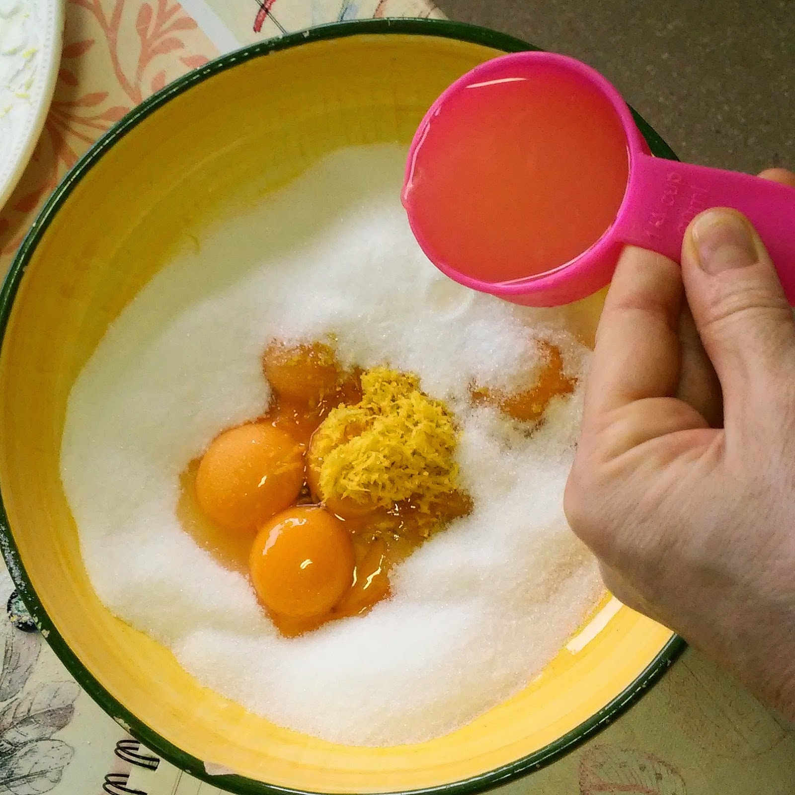 Para comenzar separamos las yemas de las claras y las llevamos a un bol. Añadimos el azúcar y la ralladura y el zumo de limón, y la sal.