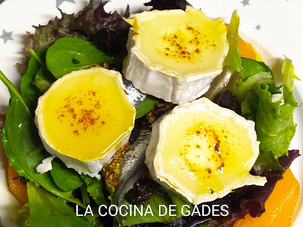Ensalada de queso de cabra con anchoas, ideal para cenas o como entrante en cualquier comida. Ingredientes para la ensalada:Bolsa de ensalada de brotes tiernos. Rulo de queso de cabra. 1 Persimón.6 Anchoas. Uvas pasas. Aove. Mostaza a la antigua. SalPimienta. Hacemos la vinagreta, en un bote pequeño añadimos sal, pimienta, una cucharadita de mostaza y cubrimos con aove, tapamos y renovemos enérgic ...