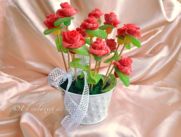 "Refrany;Mes de flors, mes damors"Mes de flores, mes de amores.Pues no, no estamos en mes de flores, porque Febrero no lo es, pero....podemos fabricarlas y si encima son de dulces, mejor que mejor ¿no? Hoy os propongo preparar un ramo de rosas de chuches. Podemos prepararlas para regalar a alguien especial.La podemos poner en ramillete, en un bolsito, una maceta......Para ello necesitaremos; Palit ...
