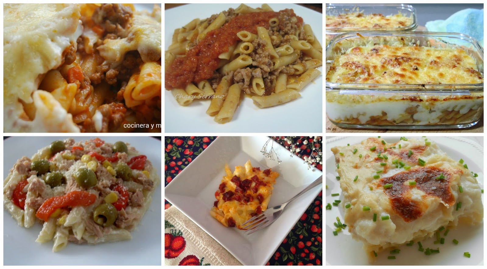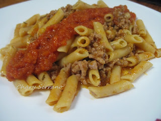 Chary desde el blog Mi cocina y otras cosas nos deja estos macarrones con carne y tomate. Lo curioso de esta receta es que utiliza tomates frescos para hacer la salsa y cuando los trocea para cocinarlos, usa el jugo que sueltan, le agrega agua y en ese caldo cocina los macarrones. Además prepara un sofrito con la carne picada, cebolla , ajo, laurel y vino. Sirve los macarrones acompañados de las dos salsas. En el enlace de la receta pueden ver cómo elabora sus macarrones y además nos ofrece video-receta para no perdernos nada.