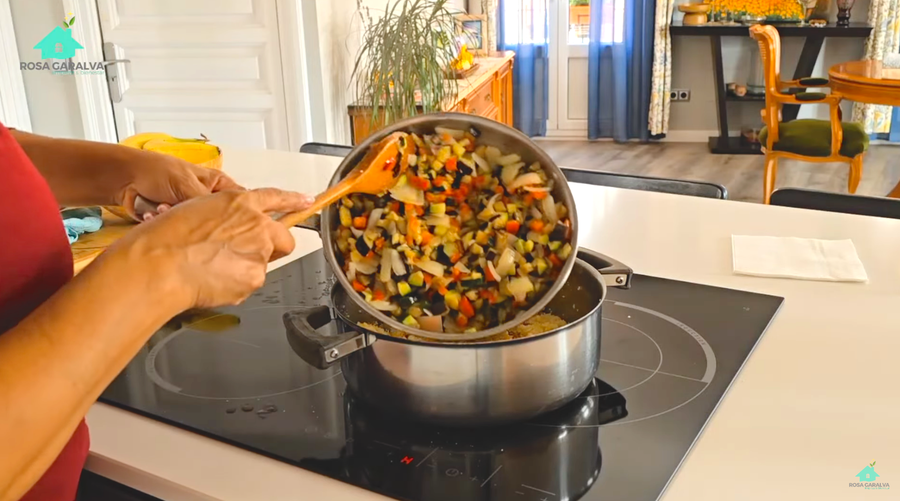 - Incorpora el cuscús cocido a la sartén con los vegetales. Mezcla bien y ajusta la sazón con sal, pimienta y tus especias favoritas.