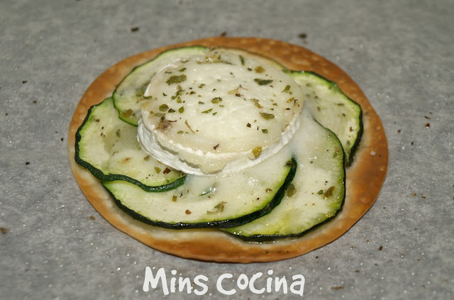 Cogemos cada oblea de empanadilla y ponemos un poco de calabacín y una rodaja del queso encima.