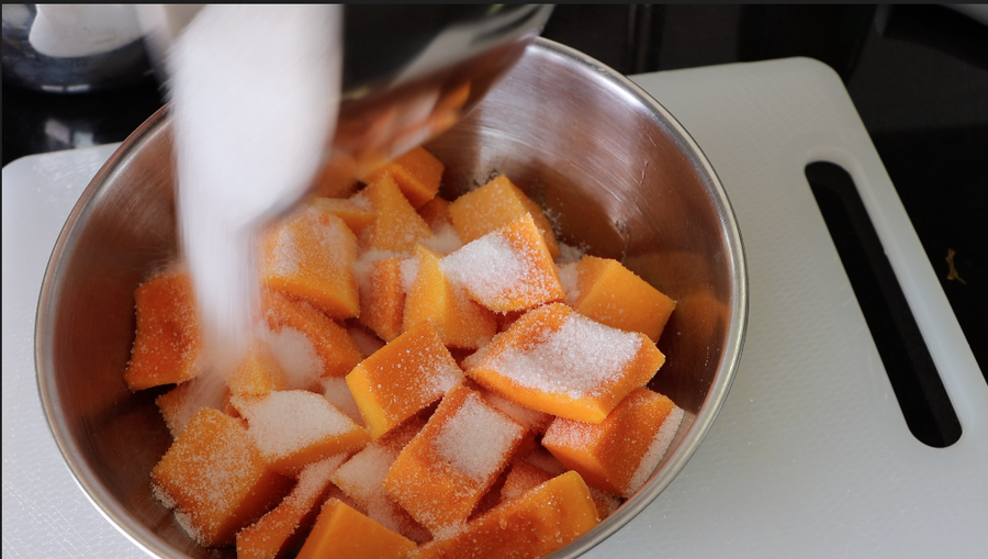 2. Dividir la calabaza en 3 partes y ponerlas en un bol una a una, espolvoreando cada capa con azúcar. Le agrego un poco de jugo de limón junto con el azúcar. (unas gotas)
