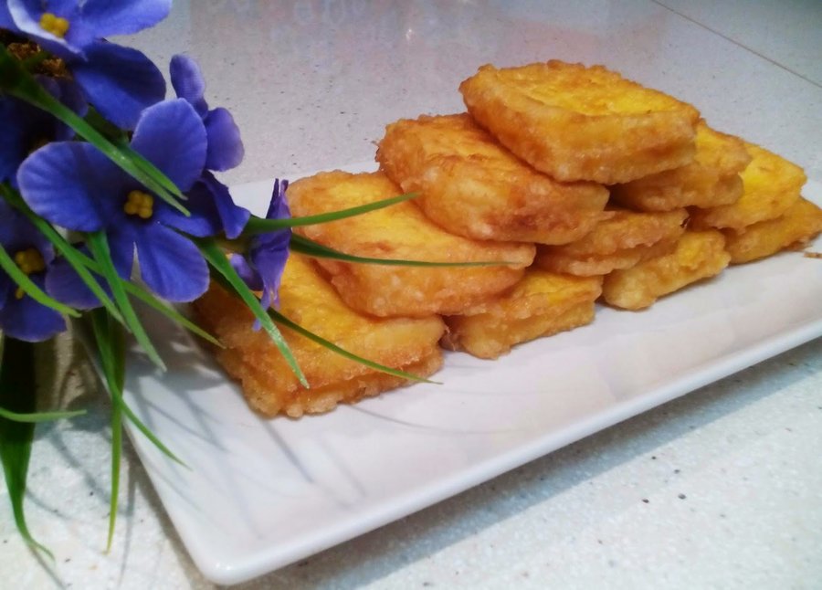 Se deja enfriar. Cortamos cuadraditos, pasamos por harina y después por huevo, freír en una sartén con bastante aceite de girasol.