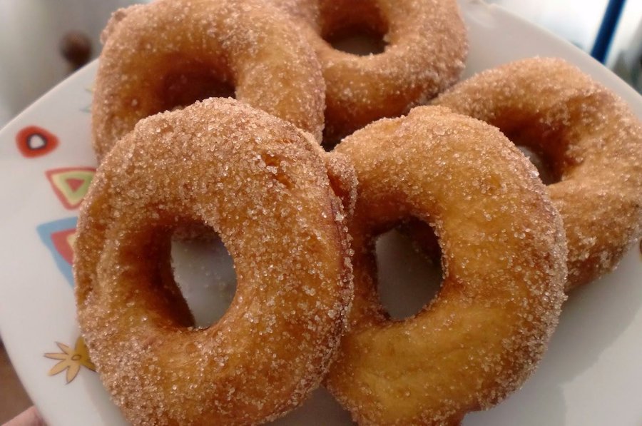 Dejamos sobre papel absrovente y rebozamos en azucar y canela
