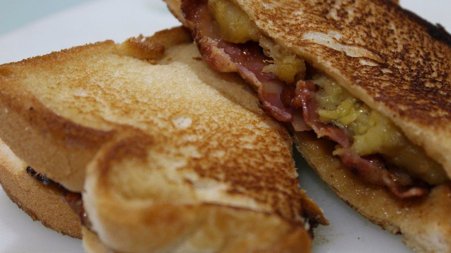 Empezamos friendo el bacon en la sartén hasta que quede bien crujiente. En la propia grasa que ha soltado, salteamos el plátano cortado ya en rodajas y cuando este doradito, terminamos de caramelizar añadiéndole la miel. Por otra parte,cogemos las rebanadas de panel y las untamos con una buena cantidad de mantequilla de cacahuete, colocamos el bacon, coronamos con el plátano caramelizado y ponemos la otra tapa. Por último, añadimos un poco de mantequilla normal a la sarten y tostamos el sandwich por ambas caras con cuidado de que no se nos desmonte ni se nos queme.