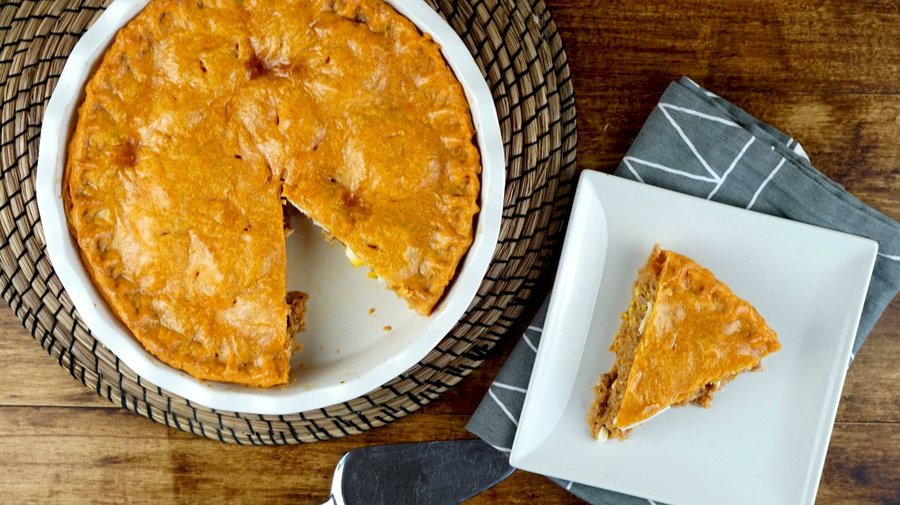 Para preparar esta masa vamos a tamizar la harina y agregar la sal y el pimentón y mezclar, después hacer un agujero en el centro y agregar todos los líquidos: aceite, vino, leche. Mezclar todo hasta que se nos forme una bola de masa que no se nos pegue a las manos. ¡Y voilà! ¡Ya la tenemos lista! Ya tenemos una masa sin levadura, sin amasado, sin reposos y lista en 5 minutos! Ahora vamos con el relleno: en una sartén sofreír la cebolla picada con el atún, agregar unas cucharadas de tomate y sazonar al gusto. Solo hay que dejar que el relleno enfríe. Ahora solo nos queda dividir nuestra masa y estirarla con ayuda de un rodillo. Yo la empanada la hice en un molde, así que engrasamos un molde, colocamos nuestra masa y la rellenamos con el relleno que habíamos preparado y los huevos duros cortados a rodajas. Cubrimos con otra lámina de masa para taparlo, cortamos lo sobrante y realizamos un cierre o un sellado en los bordes. Ya solo nos queda pincelarlo con huevo batido y hacer unos pequeños cortes por donde salga el vapor. ¡Y si deseas ver el paso a paso de cómo montarla en un molde no te pierdas el vídeo.