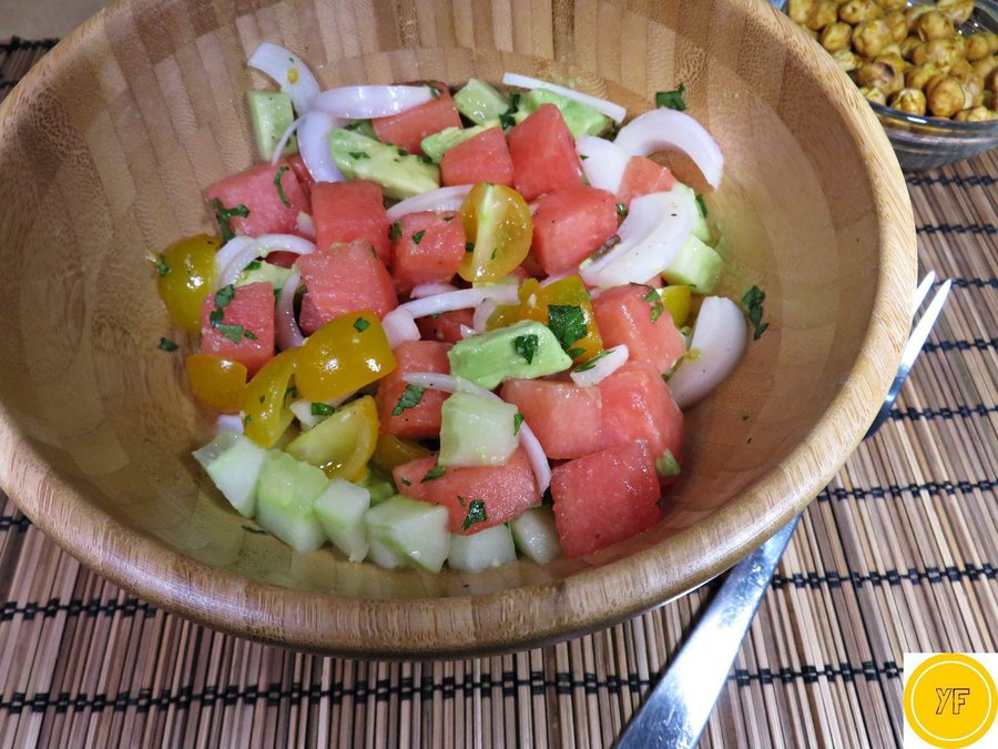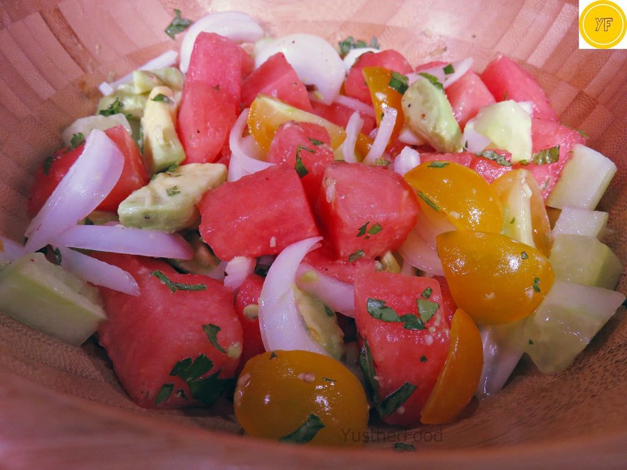 1. En un cuenco agregar la sandía, cebolla roja, tomates (pueden ser de varios colores o solo uno), el perejil, la hierbabuena, y el aguacate.