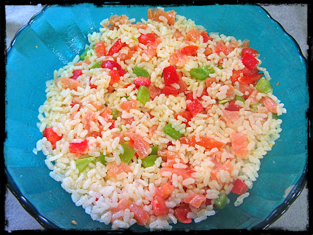 Picamos en cuadritos pequeños (pero no pequeñísimos: se tienen que "notar") el salmón y las verduras, y lo mezclamos con el arroz. Salpimentamos.