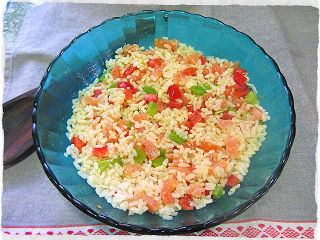 Ésta no es sino una de las múltiples variantes de la ensalada de arroz. Pero los ingredientes que lleva hacen que sea fresquita y nada pesada.