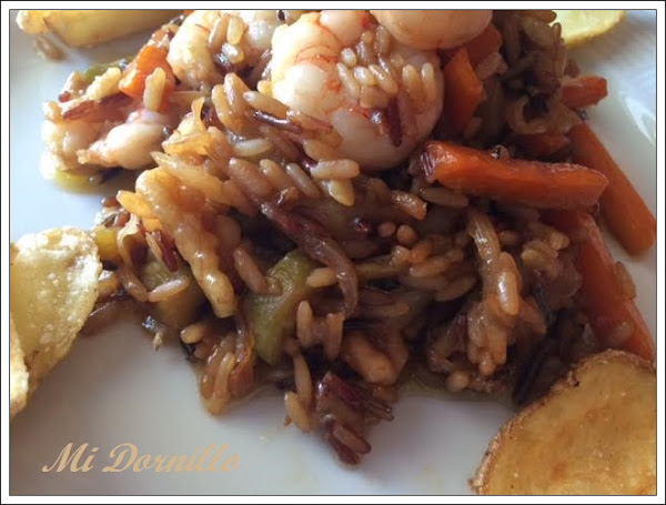 1/2 vado de arroz salvaje,gambas cocidas,salmón ahumado en lonchitas,pimiento rojo-verde-amarillo,cebolleta,apio blanco,maiz dulce en grano,aguacate,zanahoria,vinagreta (2 cucharadas de aceite de sésamo-4 cucharadas de vinagre de arroz-1 cucharadita de miel-1 cucharada de salsa de soja-1 cucharadita de salsa de tomate-unas gotas de tabasco-sal)Ponemos en una cazuela el agua correspondiente a 4 veces el volumen de arroz con un poco de sal, llevamos al fuego.