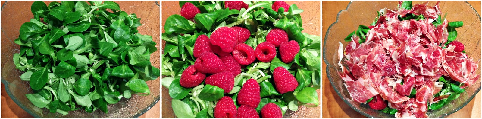 En una fuente coloca los canónigos (previamente lavados y bien escurridos), añade la cajita de frambuesas y el jamón ibérico en tiras. Por último, pica unas 25 hojas de menta y añade una vinagreta de limón, sal y aceite; 4 cucharadas de aceite por una de limón