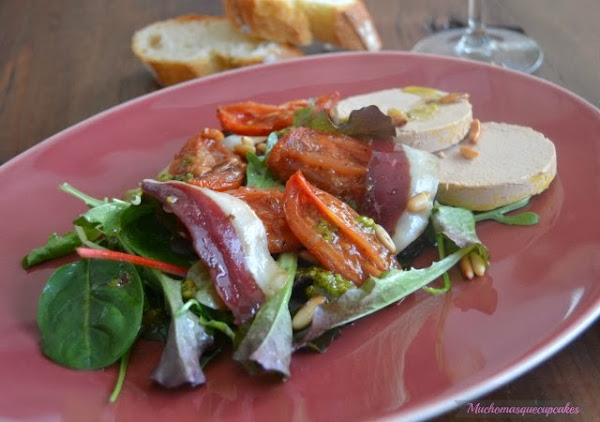 Pensando en San Valentín.Sí, ya estoy en modo San Valentín. Es verdad que queda casi un mes pero así somos, siempre pensando en el próximo acontecimiento que celebraremos con algún plato exquisito.Esta ensalada la tomé en un restaurante no hace mucho y me gusto tanto que no dudé en reproducirla en casa. Como todas las ensaladas, se hace en un momento, excepto los tomates confitados que los podemos ...
