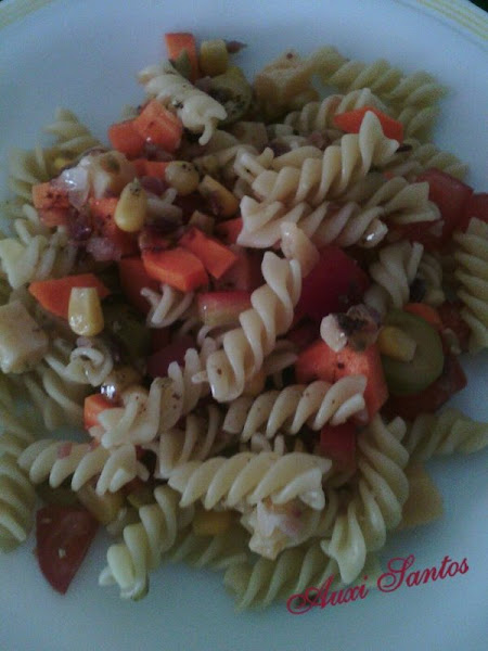 Colamos la pasta y la pasamos por agua fría, escurrimos bien y añadimos a la fuente, si lo queremos caliente no pasamos por agua fría, mezclamos y servimos. Buen provecho