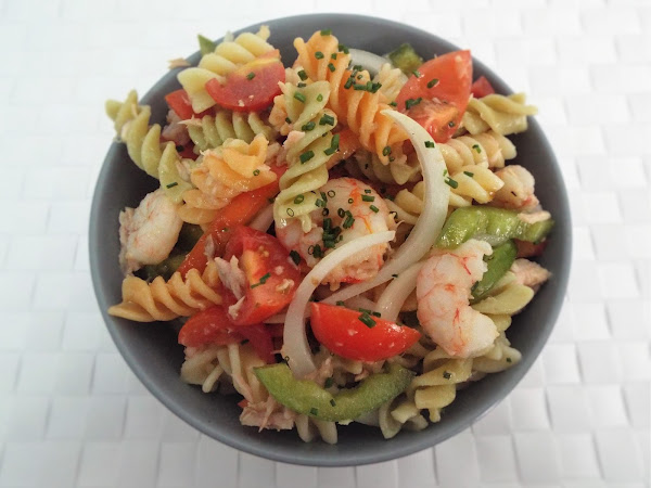 Pasta,Huevo,Atún en aceite,pimiento verde,Pimiento rojo,Tomate,Zanahoria rallada,Maiz,Aceite,Limón,Pimienta negra,OréganoPor otro lado hacemos el aliño, mezclando aceite, jugo de limón, pimienta negra y sal. Lo echamos sobre la pasta y ponemos encima el huevo cortado en rodajas decorando.