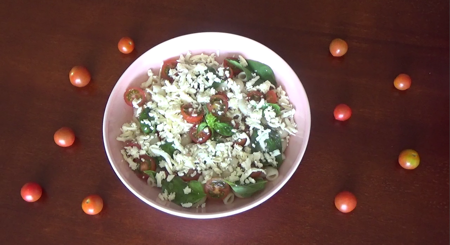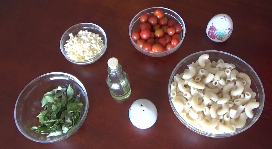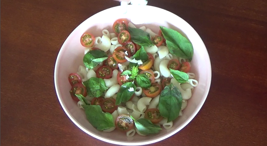 Cocina la pasta como dice el empaque y déjala enfriar, corta los tomates cherry a la mitad, en un plato hondo se pone la paste, los tomates, la albahaca, los copos de queso.