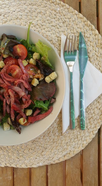 Aclaramos los brotes de lechugas con agua fría, escurrimos y aliñamos con vinagre de manzana, aceite y sal.
