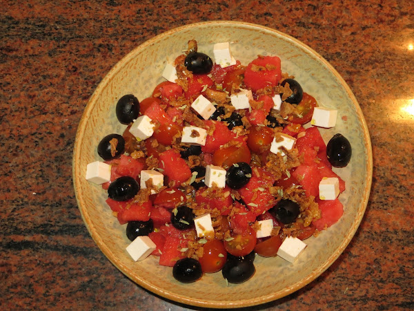 Te aseguro que no te creerás el sabor tan delicioso resultante de combinar la sandía con la cebolla, las aceitunas, el queso feta y la albahaca.