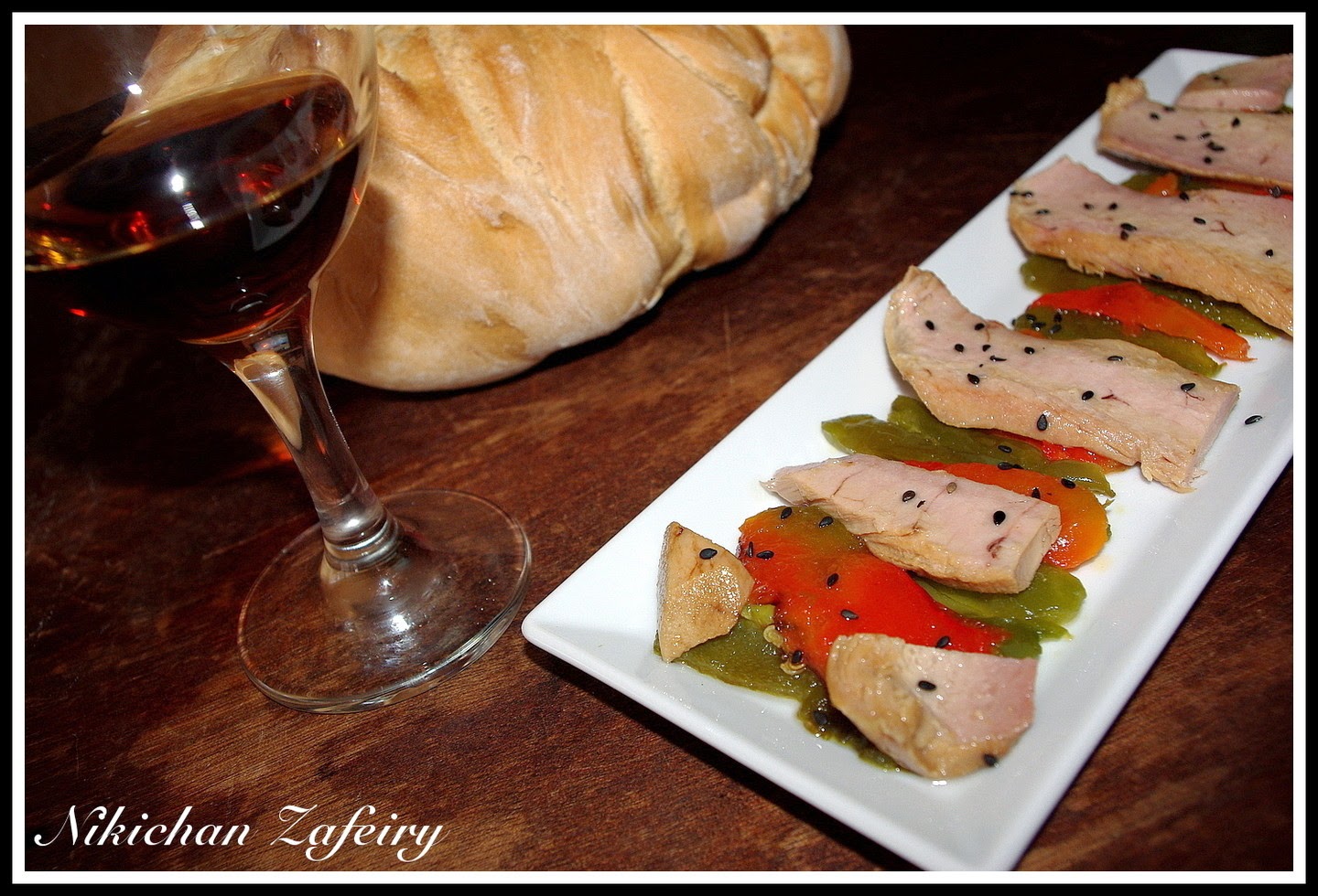 Colocar sobre ella los lomos de ventresca y encima los pimientos en tiras con los ajos y un buen chorro de aceite de oliva virgen.