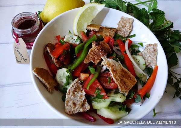 Vamos a por la receta de la ensalada libanesa o fattoush. Es muy similar al tabulé, se diferencia en el corte más grueso de las verduras, en el uso de la especia zumaque y en la incorporación de pan de pita troceado, que consigue darle un aire de ensalada poco habitual. Si no tenéis zumaque, la ralladura fina de la piel del limón y la sal hacen un sustituto razonable.