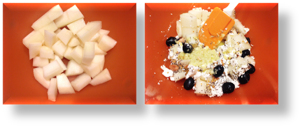 TROCEA EL MELÓN y añade a un bol junto con la cebolla laminada, el queso feta desmigado, las olivas o pasas, las almendras tostadas (enteras), el polen y la chía.