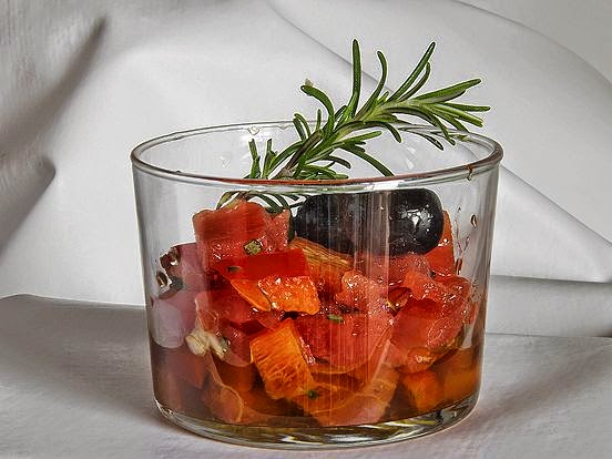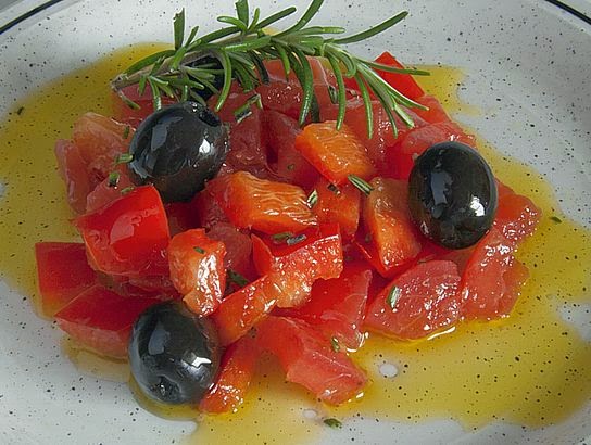 ...con un toque verde, negro y oro. Vamos, casi la descripción del traje de un torero. Una idea colorista que alegrará nuestra mesa a la par que satisface a nuestro paladar y aporta vitalidad a nuestro organismo. Es tan fácil de preparar que casi no necesita explicación y su único secreto es conseguir ingredientes de la mejor calidad, lo que en este caso no significa encarecer la receta. Compre unos pimientos bien rojos, con la carne dura y lustrosa, sin manchas ni imperfecciones y unos tomates maduros pero no blandos, y utilice el mejor aceite de oliva virgen extra que encuentre y lo tendrá todo hecho. Vamos a ello.