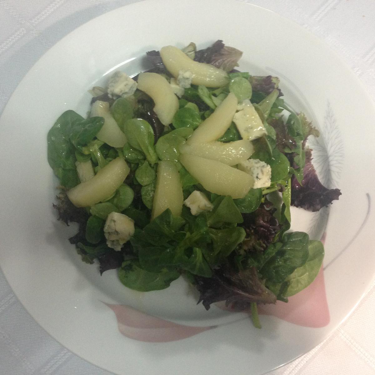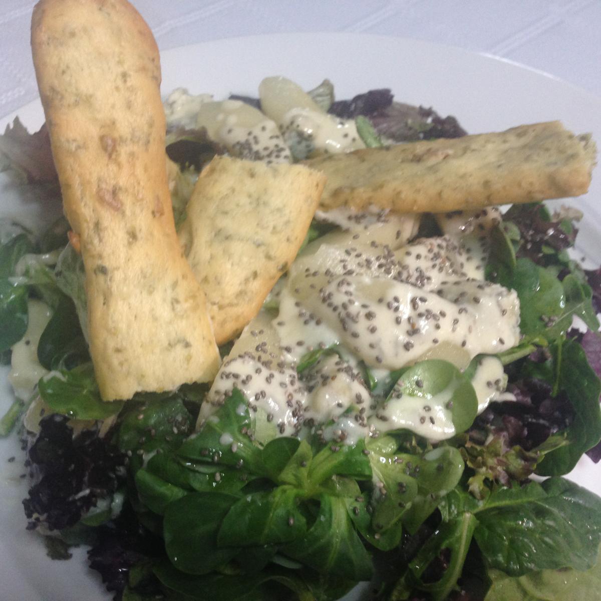 Coge la lechuga, pon a gusto de sal y adereza con la vinagreta, decórala con el queso y la pera. Cuando vayas a servir, calienta tu salsa gorgonzola y baña la lechuga. Así de fácil, así de rica. La mía esta salpicada con unas semillas de chía que tan de moda está.