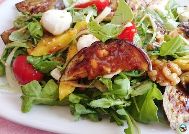 Y dejamos para el final esta increíble ensalada que nos trae Huele Bien, En ella vamos a combinar verduras como las berenjenas, los tomates, la rúcula y la cebolla con unas perlas de mozzarella, nueces y sésamo. Esta ensalada tan original como rica lleva un aderezo muy original , en un bol ponemos: 1 cucharada de crema de cacahuete, el zumo de limón,aceite de oliva y la crema balsámica. Lo batimos todo bien y lo añadimos. ¿A que se os hace la boca agua?. Pues pasaros por el blog para verla.