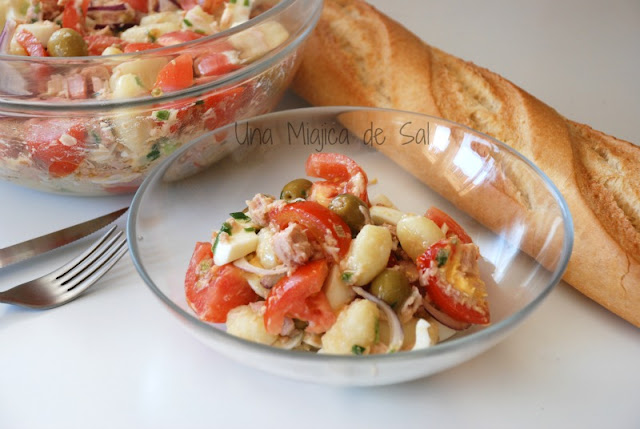 También podemos convertir una ensalada en un aperitivo ideal como la que podemos ver en el blog Una miajica de sal y en la que el tomate, la cebolla, el atún y el huevo cocido se mezcla con los gnocchi dando lugar a un gran plato.