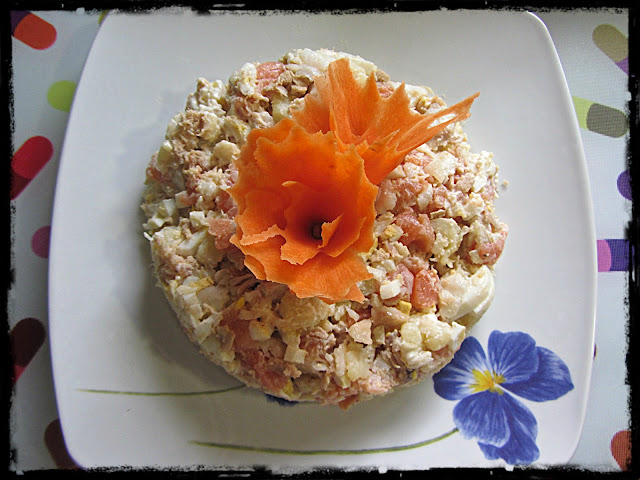 Troceamos el salmón, escurrimos muy bien y troceamos el atún, desmenuzamos la merluza (no en trozos demasiado pequeños), cortamos las patatas en trocitos o cuadritos no muy grandes, y picamos el huevo duro. Pero no hay que desmenuzar excesivamente ni la merluza ni el atún, ni hacer trozos excesivamente chicos de los demás ingredientes: tienen que notarse.