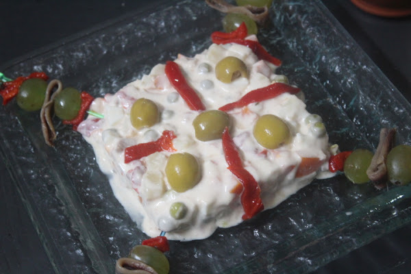 Pelamos y cortamos en cuadraditos las patatas, los huevos, la zanahoria, los pimientos y las aceitunas y lo llevamos a un bol. Dejamos algún ingrediente para decorar. Añadimos el atún sin escurrir, el vinagre y la sal y mezclamos todo. Tapamos con film transparente y reservamos en la nevera unas dos horas. Una vez pasado el tiempo la ponemos en una fuente y la decoramos al gusto con mayonesa, pimiento del piquillo en tiras, unos pocos de guisantes, huevo rallado y aceitunas. También lo podemos decorar de manera individual como en la foto. Para ver como lo he decorado podéis ver el vídeo.