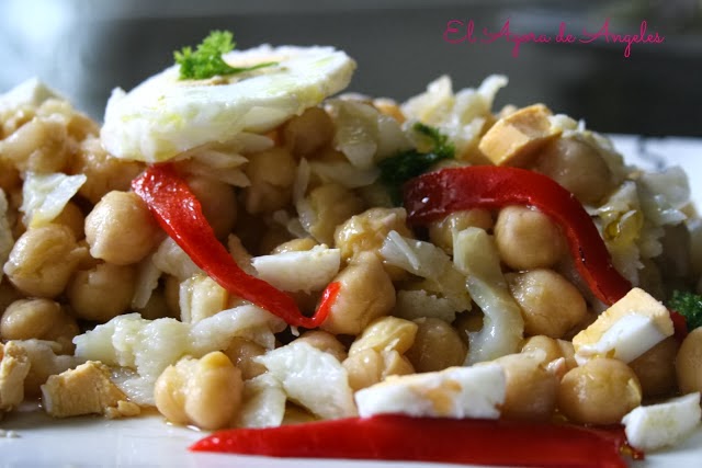 Muy adecuada para éstas fechas resulta la ensalada que nos propone Ángeles, ENSALADA DE GARBANZOS CON BACALAO.