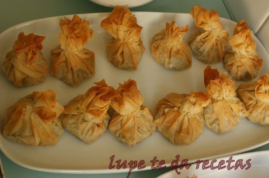 Con pasta brick, con masa philo o on obleas se pueden hacer saquitos y caramelos que esconden secretos en su interior. El resultado es muy atractivo y la neutralidad del sabor de esas masas permite utilizar multitud de rellenos.Saquitos de gambas y gulas (Receta e imagen de Gulofer)