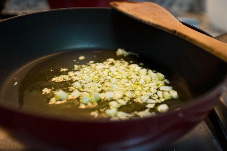 Una vez terminado esto, se pone un chorrito de aceite de oliva en la sartén, y antes de que se caliente ponerle ya el ajo, que sino se quema. Hacerlo a fuego lento.