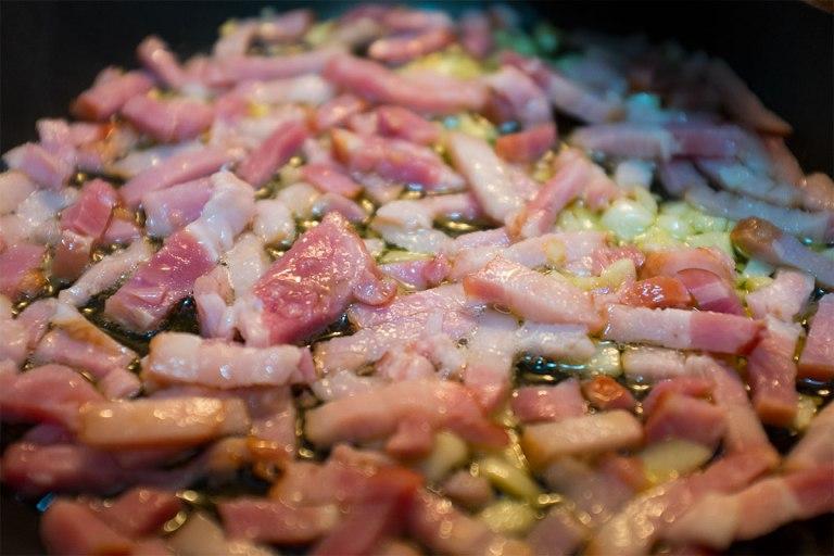Hay que esperar muy poquito a añadir el bacon, para que se vayan haciendo a la par.