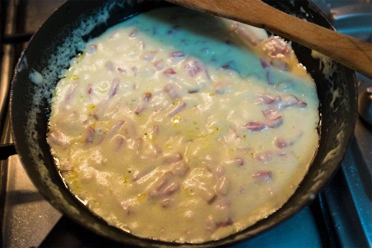 Cuando se vea el bacon ya prácticamente hecho se añade la nata, se sube un poquito la potencia del fuego para que hierva y remover con ganas pero sin que se salga.