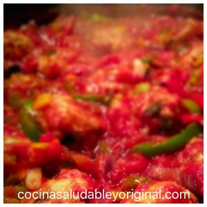 7. Pelamos la cebolla y la cortamos bien pequeña, igual hacemos con las cabezas de ajo. Pochamos en una sartén la cebolla con el ajo (con un poco de aceite en spray) y cuando empiece a transparentar añadimos los pimientos. Dejamos cocinar unos minutos más y añadimos las dos latas de tomate picante y las albóndigas. Mezclaremos bien una vez ya hemos colocado todos los ingredientes.