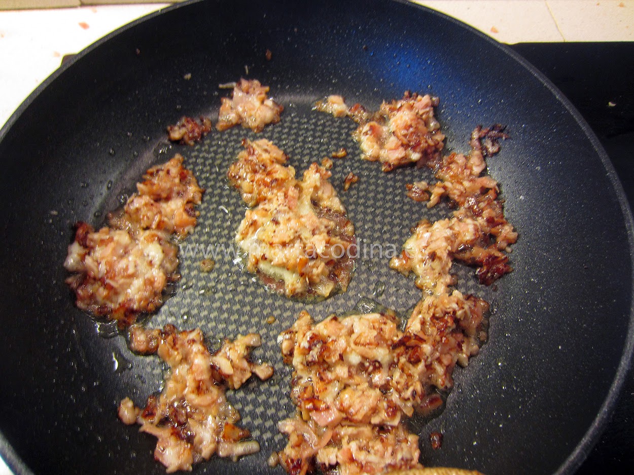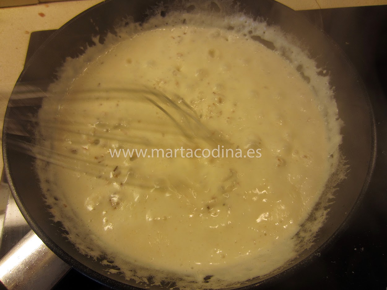 En la misma sartén, pasaremos un papel de cocina para quitar restos de grasa y pondremos el bacon desgrasado junto al queso. Se formará una argamasa, ya que el queso se derrite. No importa, ya que ahora incorporaremsos la crema de leche y desglasaremos, ayudándonos de unas varillas.