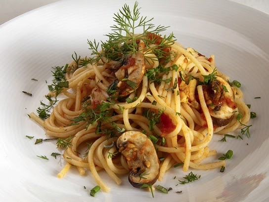 Después de algunas entradas hablando de hierbas y especias, parece adecuado preparar un plato donde las hierbas, por ejemplo, sean protagonistas o al menos jueguen un papel destacado en la obra, Y está claro que pocos ingredientes se prestan a ello con tanta alegría como la pasta. Vamos, que casi se diría que están hechos para ser mezclados juntos. Claro que también es verdad que pocos ingredientes hay tan generososcomo la pasta, siempre dispuesta a compartir su relevancia en la mesa dejándose acompañar por toda clase de salsas y aderezos. Y las hierbas se prestan a ello como pocos . Estas plantas son un regalo espléndido que nos hace la naturaleza, un lujo al alcance de todos: su perfume deleita nuestro olfato, y sus propiedades salutíferas nos ayudan a conservar, o a recuperar, el bienestar. Dan carácter a la receta más desangelada y enriquecen los plato más sencillos aportando nutrientes, y como casi todas son digestivas resultan muy adecuadas para suavizar los efectos de un buen plato de espaguetis. Y como la salsa de tomate que vamos a utilizar es muy aromática gracias al apio y al hinojo, nos encontraremos con un plato en verdad apetitoso. Emplearemos hierbas frescas, que en mi opinión resultan más adecuadas para resaltar el carácter de esta receta.