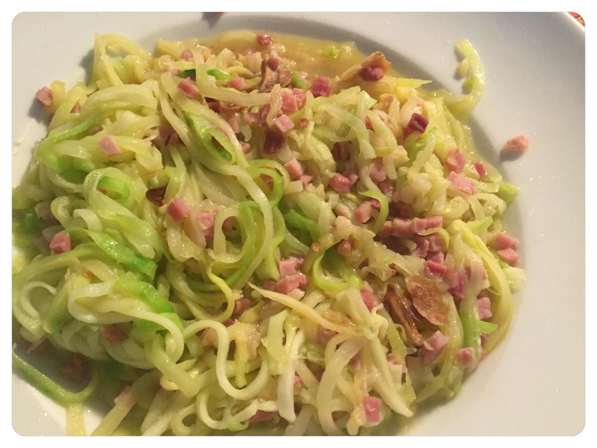Pelamos los calabacines y les quitamos el culo, gracias al cortador en espiral los convertimos en espaguetis. Reservamos.