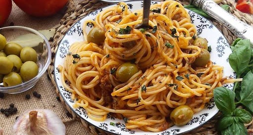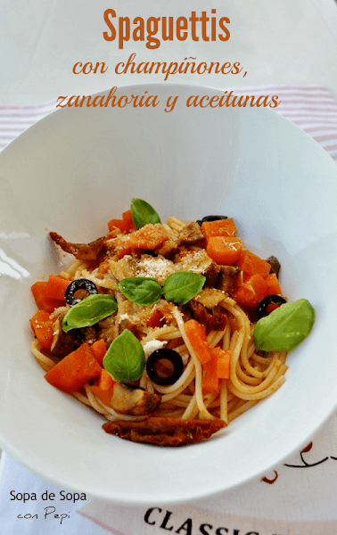 Os traemos unos espaguetis templados con verduras y aceitunas.
