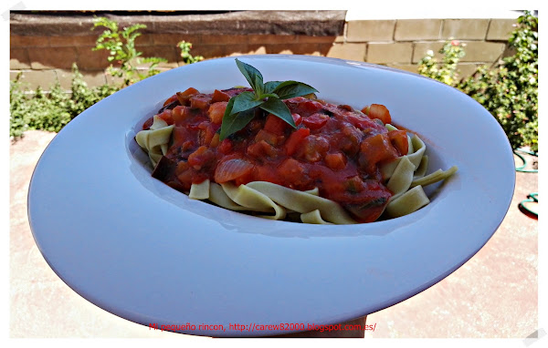 Cebollitas francesas 2 setas calabacín 1 trozo berenjena 1 trozo tomates cherry tomate maduro 1 orégano sal pimienta espirales de colores queso semicurado para rallarPonemos a cocer la pasta y la dejamos al dente. Rallamos la cebollita y la rehogamos,añadimos las setas. Cortamos el calabacin y la berenjena en dados. Ponemos con la cebolla y las setas. Salpimentamos. Añadimos la pasta cocida y escurrida para que se vaya impregnando de todos los sabores,cortamos en trozos o rodajas unos tomates cherrys y lo añadimos a la pasta con el refrito. Rallamos un par de tomates maduros y lo mezclamos con el liquido del bote de las setas(si las setas son naturales no le pongais mas que el tomate) lo echamos por encima y damos unas vueltas. Le ponemos orégano y dejamos a fuego lento unos minutos.(no mucho para que la pasta no se os pase). Para servir, rallarle un poquito de queso del que os guste por encima. Cortad unos cherrys a los que pondreis , sal, óregano y unas gotas de aceite de oliva, espolvoread el plato con un poco de orégano (o perejil, si no quereis poner más de esta especia).