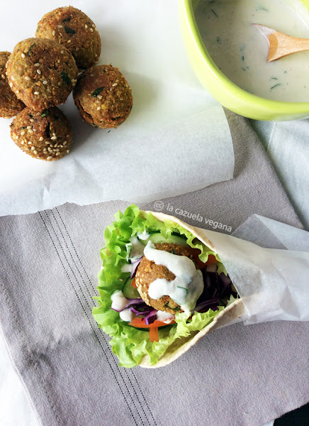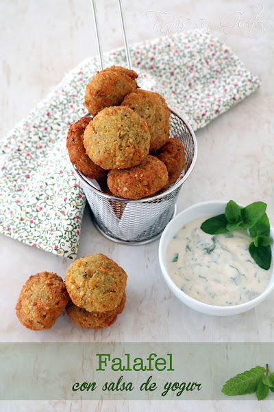 En primer lugar, tendremos que dejar los garbanzos la noche anterior a remojo. Una vez que hayan pasado esas 12 horas, podemos empezar con la receta, cuyo primer paso será triturarlos, con ayuda de una picadora o de la batidora. Cuando se haya hecho una especie de masa o harina de garbanzo, añadiremos el resto de ingredientes que te he indicado para el falafel como tal. El aspecto final será el de una masa con textura de arena. Con esta masa, haremos bolas de falafel que después aplastaremos, y las colocamos en una bandeja de horno. La idea es que estén dentro durante 50 minutos a 180 ºC para conseguir que queden crujientes en el exterior y cremosos en el interior.Mientras tanto, vamos a preparar la salsa de yogur. Añadiremos una cucharadita de cada uno de los ingredientes indicados como sazonadores y cortaremos muy fina la hierbabuena para después mezclarlo todo con el yogur.